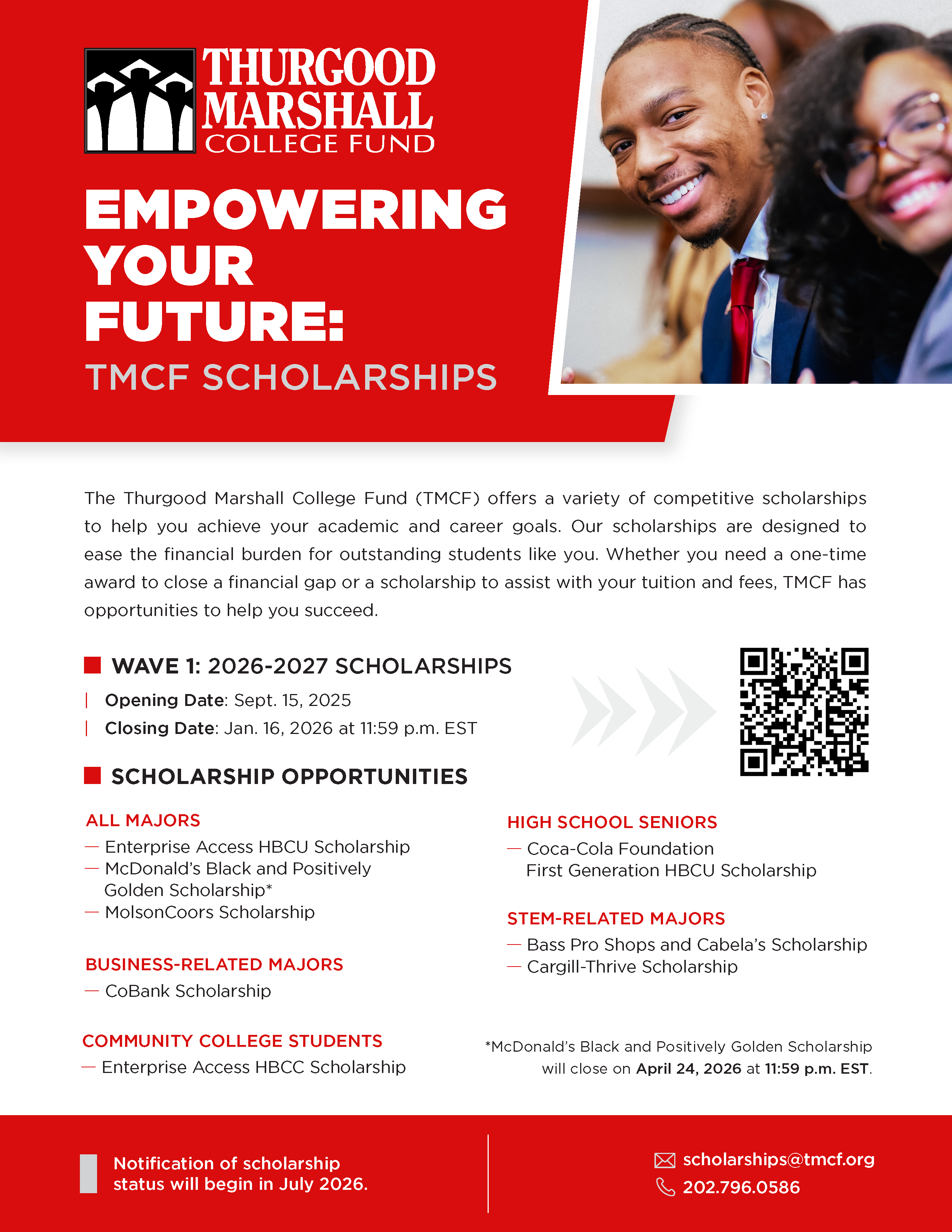 We’re excited to announce that the first wave of scholarships for Thurgood Marshall College Fund’s (TMCF) 2026–2027 scholarship application cycle officially opened Monday, September 15, 2025!